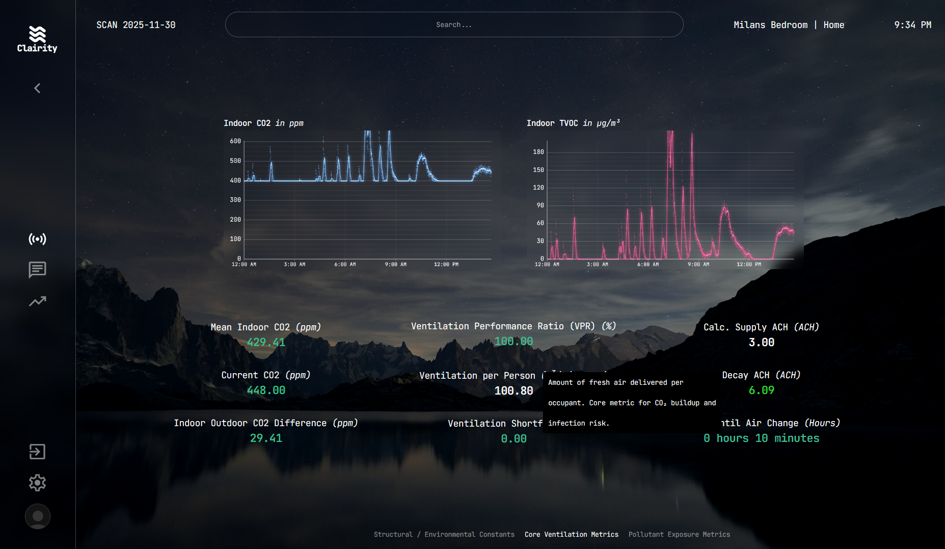 Clairity tracks how quickly rooms return to baseline air quality after occupancy: